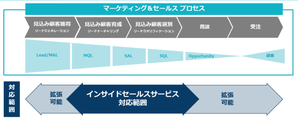 営業プロセス全体を網羅する緻密な戦略立案のもと、営業対象となる「見込み客」の創出から継続的な育成、訪問営業への確実な引き渡し、クロージングまで、商談成立に必要な全ての営業支援を実行するアウトソーシングサービスです。